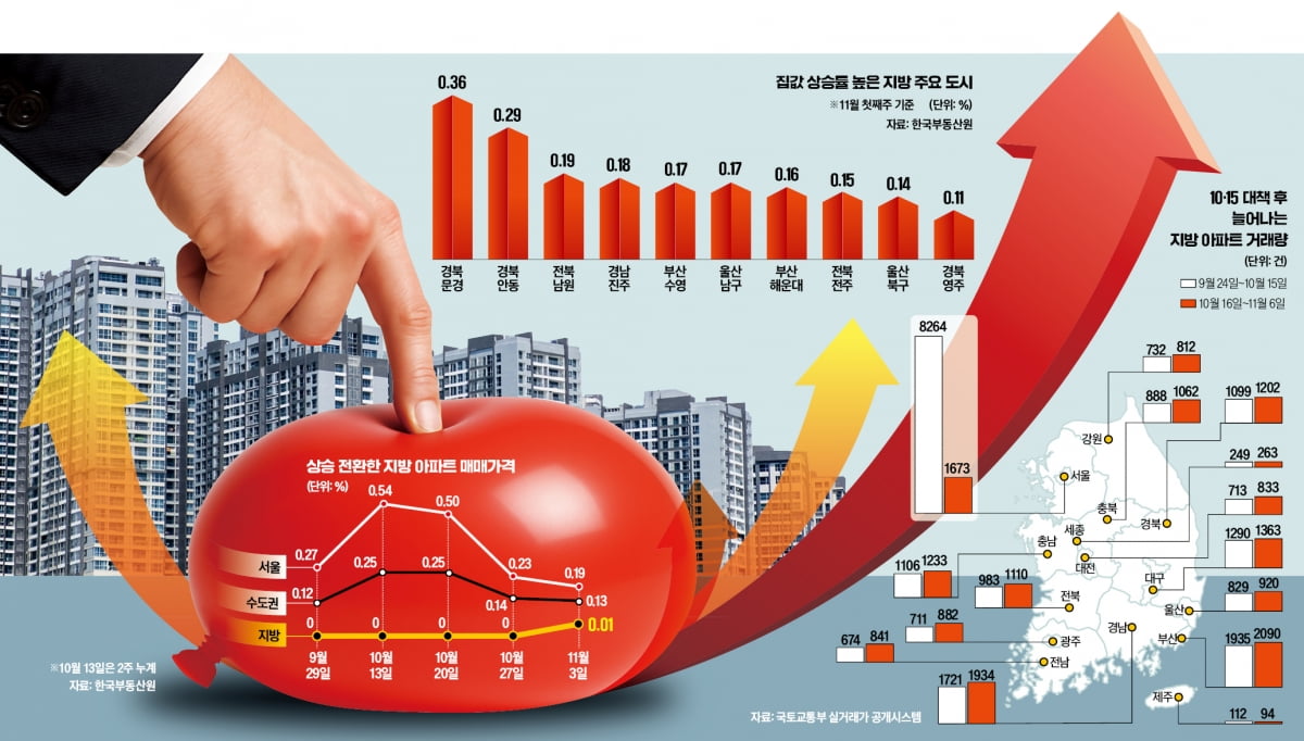 10᛫15 부동산 대책 반사이익, 서울᛫경기도 12곳 '3중 규제'로 묶자 비수도권 거래 10% 쑥, 지방 아파트 매매값 2년 만에 상승세, 부산 해운대 수영구 각각 0.16%᛫0.17% 올라, "공급 적고 신축 수요 쑥 울산᛫전주 눈여겨봐야"