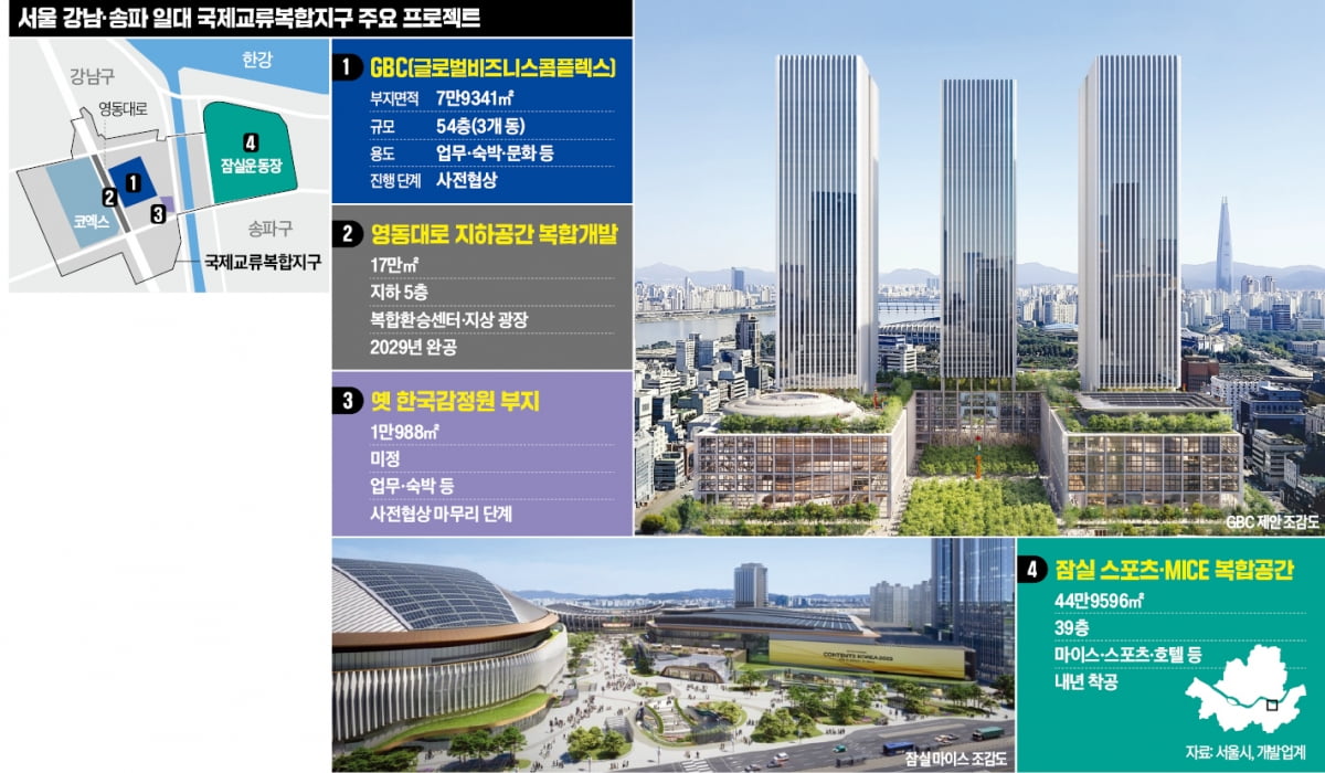 GBC᛫잠실 마이스 ... 국제교류지구 탄생, 부지 매입 11년 ... GBC '본궤도', 54층 삼둥이 타워 짓는 현대차 미래 모빌리티 혁신 거점으로 공공기여 등 쟁점 막바지 협상, 잠실운동장 일대 내년 '첫삽', 스포츠᛫마이스 복합공간 조성 전시장 규모만 코엑스의 2.5배 한강~탄천 잇는 보행로도 정비