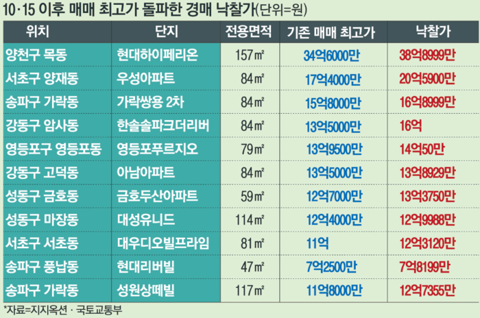 서울 아파트 경매 '불장', 실거주 의무 없어 갭투자 가능 토허제 회피수요, 경매로 몰려, 통상 시세보다 낮았던 낙찰가 10᛫15 대책후 잇단 반전 사례, 시장가격 왜곡하는 경매 과열 매매가 밀어올리는 부작용도