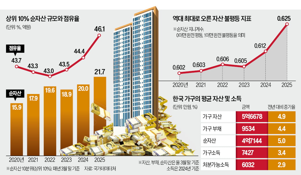 자산 빈부격차 역대 최대 ... 소득 양극화도 심화, 상위10% 순자산 22억 .. 9%↑ 하위 50% 점유율은 9% 불과 유᛫무주택자 간 격차 더 벌어져, 소득 지니계수 3년 만에 반등 청년 취업᛫민간소비 위축 여파