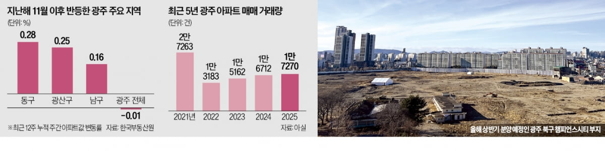 지방 부동산 시장 점검, 작년 광주 집값 1.96%↓, 작년 1.7만건 손바뀜 ... 거래 반등 작년 11월 이후 동구 0.28% 상승 '학군지' 광산᛫남구도 오름세, 챔피언스시티 상반기 분양 예정 더현대᛫호텔 조성 ... 주변 단지 기대