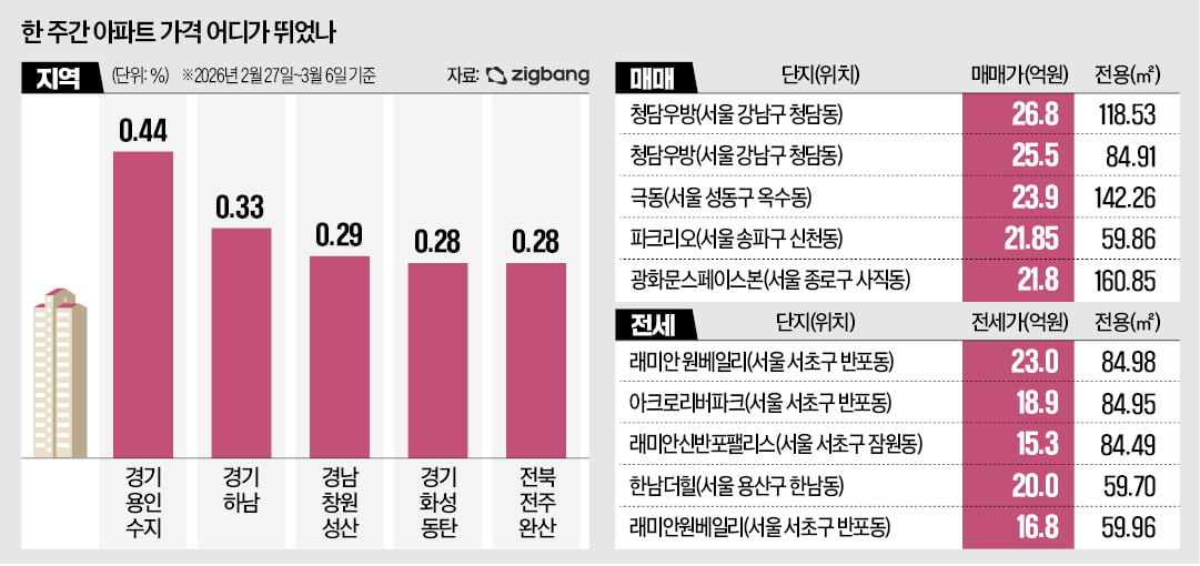 하남᛫창원 성산 상승률 뒤이어 전세는 래미안원베일리 23억 용산구 한남더힐 20억 최고가